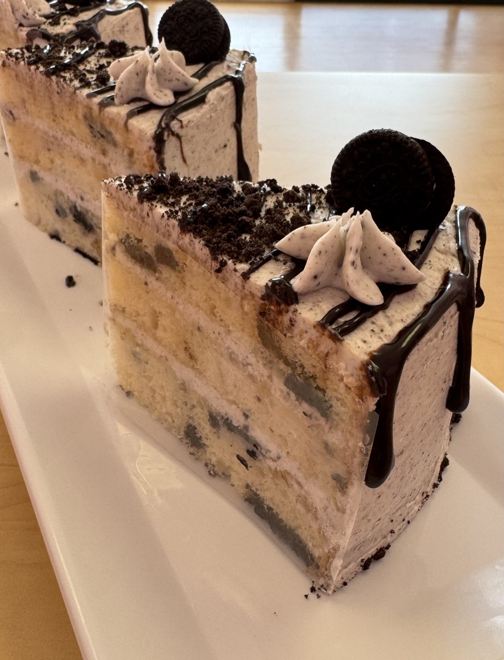Oreo Fusion cake slice__ Features moist layers, smooth cookie-and-cream frosting and a generous topping of crushed Oreo bits. A luxurious twist on a classic favorite!