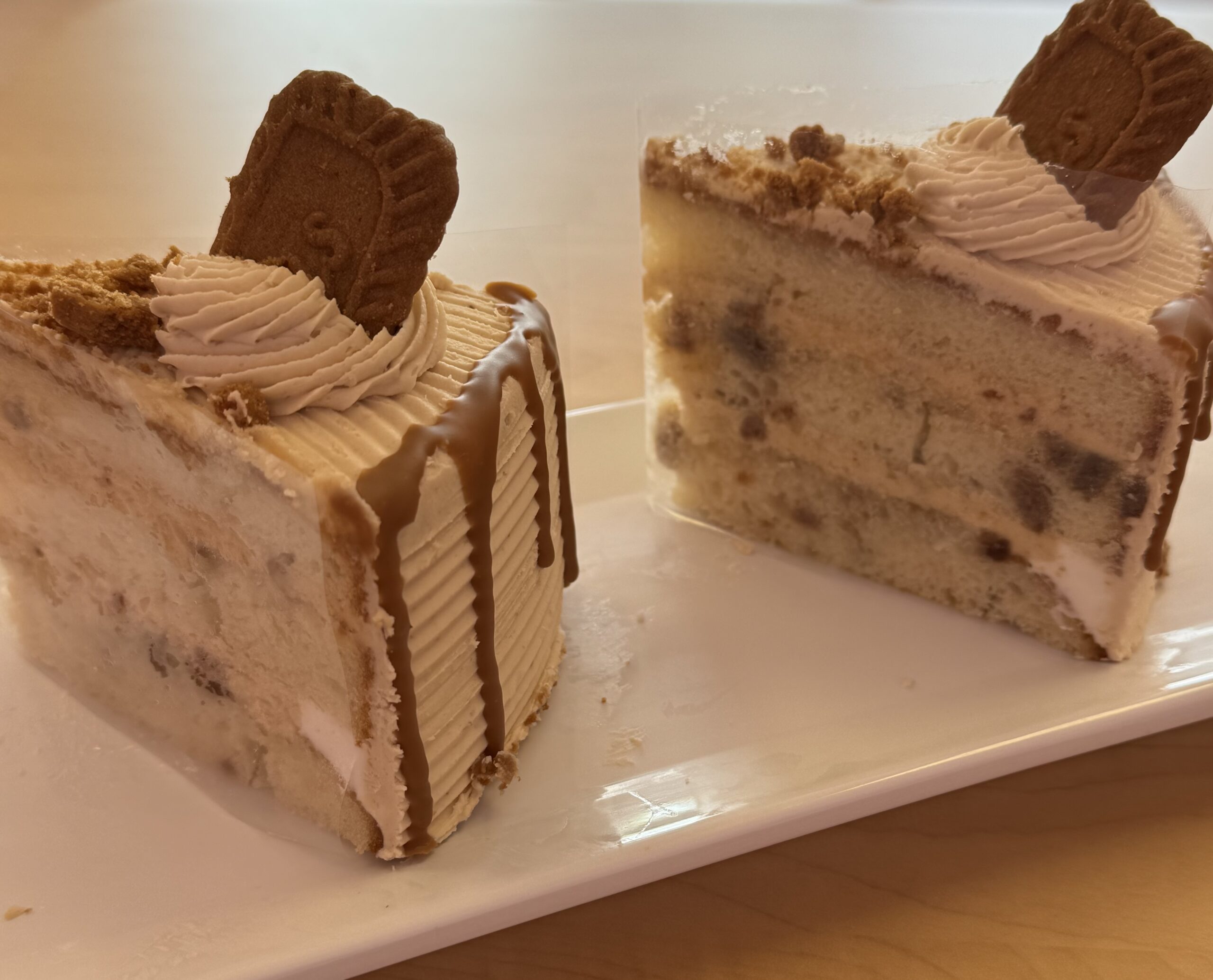 With our Biscoff Bliss Cake Slice__ Enjoy Layers of Moist caramel infused sponge, paired with luscious Biscoff cream filling. Finished with a silky Biscoff spread drizzle, every bite delivers warm, spiced, cookie richness and melt-in-your-mouth Bliss.