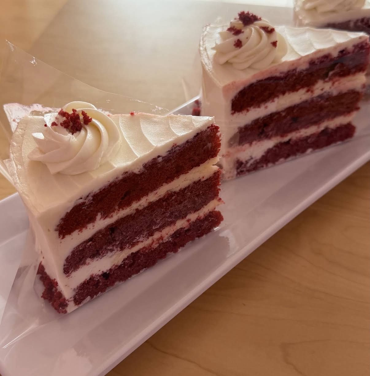 Indulge in our Red Velvet Dream Cake slice__ A velvety-soft masterpiece, layered with smooth cream cheese frosting. Each bite offers the perfect balance of buttery richness, coca warmth and silky cream, creating a truly dreamy Red Velvet experience!