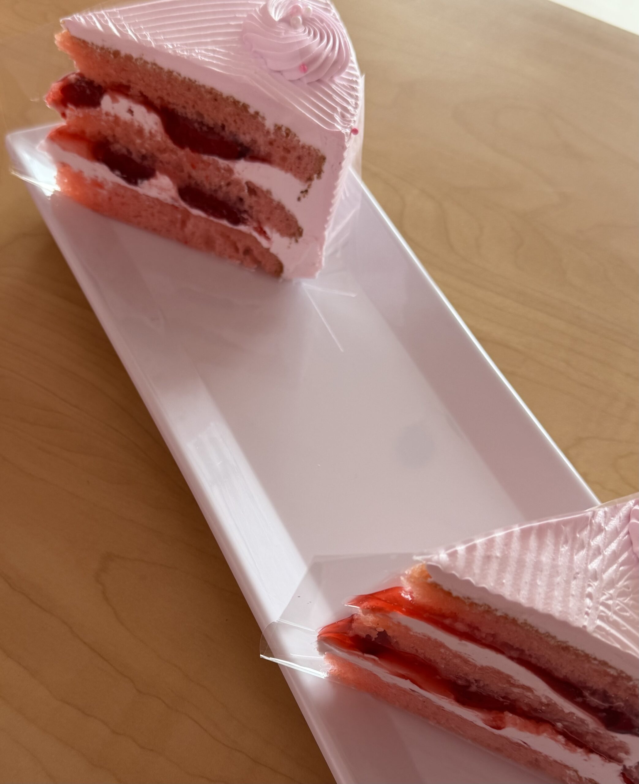 Moist strawberry sponge, creamy strawberry filling and silky frosting__ A strawberry sensation cake slice that melts in your mouth!